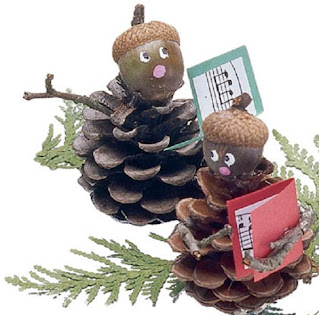 Pintar la cara en las bellotas. Pegar una bellota en la piña con un buen pegamento. Ésta será la cabeza. Utilizar ramitas para simular los brazos. Pegarlas a los costados de la piña. Cortar un cuadrado de cartulina. Doblarlo por la mitad para simular el cuaderno. Pegar dentro del cuaderno una hoja blanca donde se habrán escrito notas musicales simulando la partitura. Colocarlo pegado a la ramita que simula el brazo.